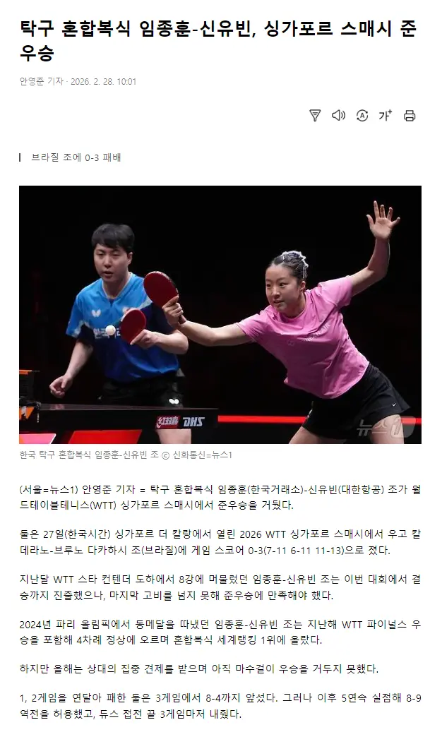 赛后韩媒发声,世界第一的混双组合申裕斌/林钟勋在新加坡大满贯获得亚军,在上个月的WTT多哈球星挑战赛林钟勋/申裕斌止步八强,这一次虽然进入决赛圈但未能越过最后一关只能屈居亚军。