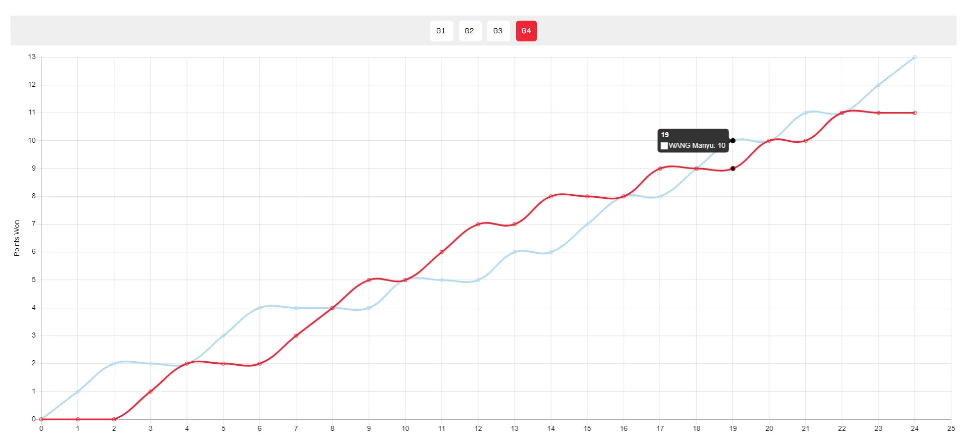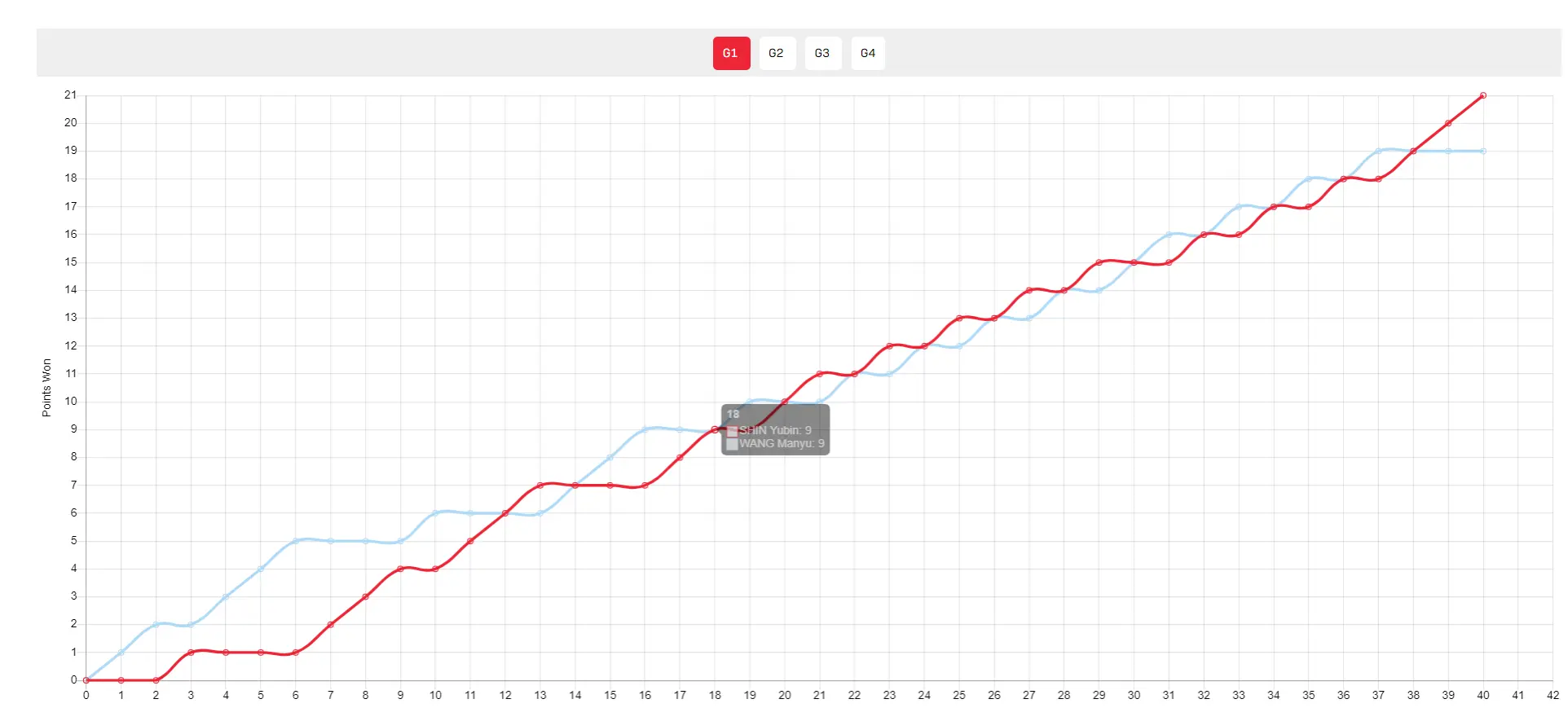 第二局与第三局王曼昱轻松取胜大比分反超,第四局开场王曼昱4-2领先,申裕斌4-4、5-5扳平,申裕斌8-5反超随后王曼昱追到8-8、9-9,王曼昱10-9赛点后申裕斌挽救两个赛点完成逆转。