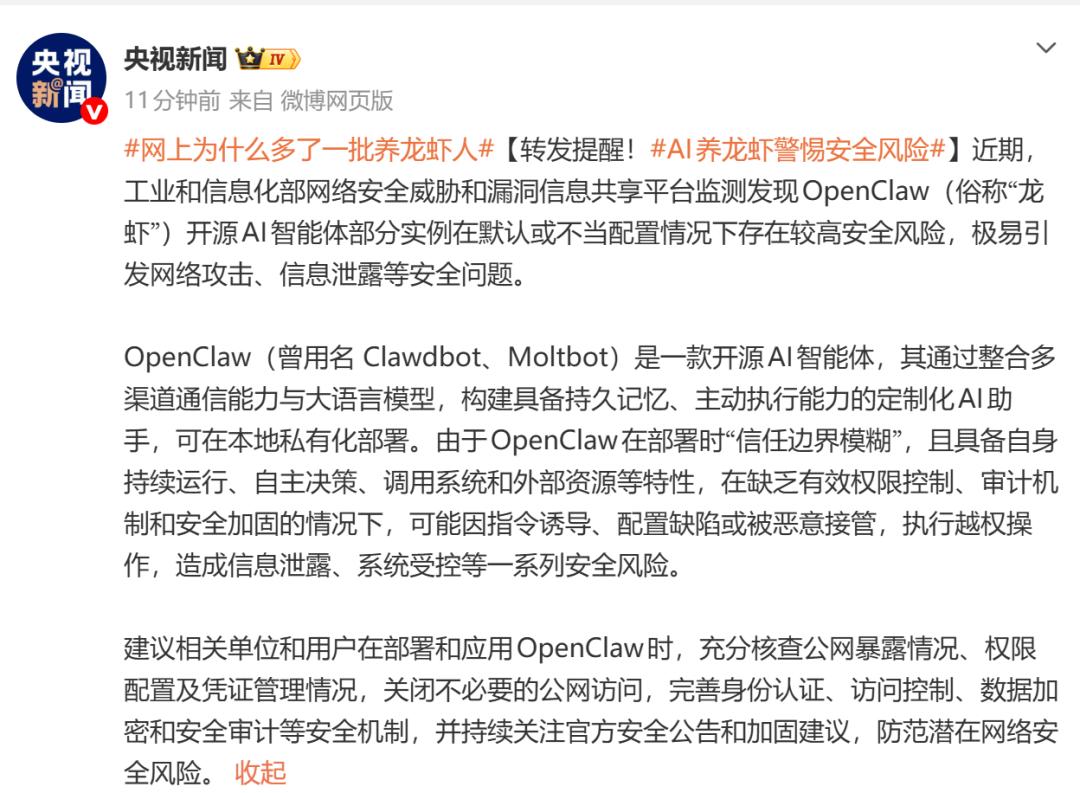 近期,工业和信息化部网络安全威胁和漏洞信息共享平台监测发现OpenClaw(俗称“龙虾”)开源AI智能体部分实例在默认或不当配置情况下存在较高安全风险,极易引发网络攻击、信息泄露等安全问题。 OpenClaw(曾用名 Clawdbot、Moltbot)是一款开源AI智能体,其通过整合多渠道通信能力与大语言模型,构建具备持久记忆、主动执行能力的定制化AI助手,可在本地私有化部署。由于OpenClaw在部署时“信任边界模糊”,且具备自身持续运行、自主决策、调用系统和外部资源等特性,在缺乏有效权限控制、审计机制和安全加固的情况下,可能因指令诱导、配置缺陷或被恶意接管,执行越权操作,造成信息泄露、系统受控等一系列安全风险。 建议相关单位和用户在部署和应用OpenClaw时,充分核查公网暴露情况、权限配置及凭证管理情况,关闭不必要的公网访问,完善身份认证、访问控制、数据加密和安全审计等安全机制,并持续关注官方安全公告和加固建议,防范潜在网络安全风险。