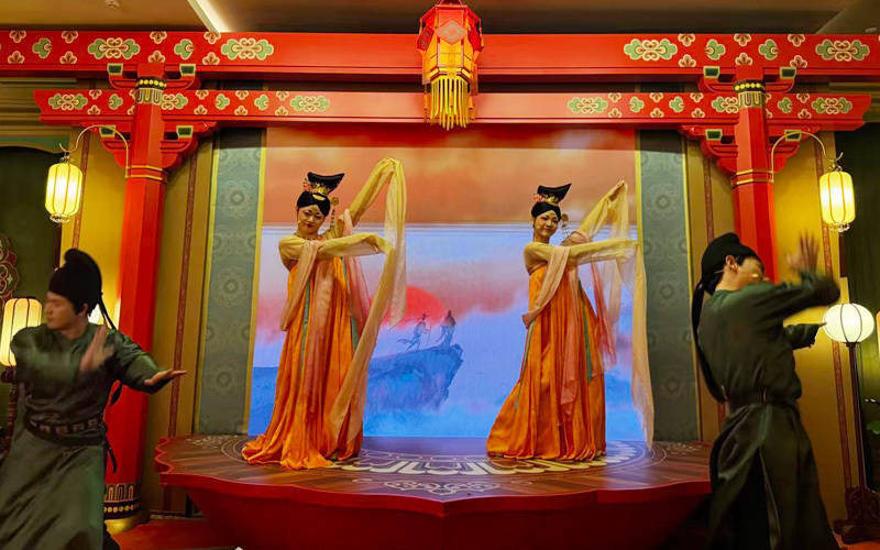 步入位于好莱坞俱乐部二层的主题餐厅,穿过古雅的花灯门廊,身着唐代服饰的“店小二”一声热情招呼,便将游人引入了影片中的世界。餐厅以盛唐国风美学为底色,将黄鹤楼等经典场景艺术化重现。游客不仅能品味到融合了武汉特色与宫廷氛围的定制佳肴,更能欣赏到从餐具器物、主题装饰到音律舞美的全感官盛景。最令人期待的,莫过于李白、高适等角色“亲临”现场,吟诗作赋,演绎盛唐气象,多位舞者身着考据严谨、设计灵感源自电影的国风服饰,以曼妙舞姿将中式浪漫氛围推向高潮,让每位游客都成为这场盛唐故事中的“主角”。